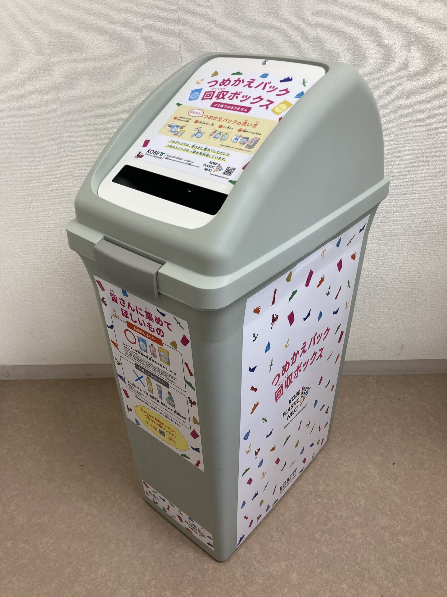 日用品の使用済みつめかえパックを分別回収して再びつめかえパックに戻す「水平リサイクル」を目指す「神戸プラスチックネクスト~みんなでつなげよう。つめかえパックリサイクル~」では、神戸市内の小売74店舗と施設38カ所に回収ボックスを設置しています。