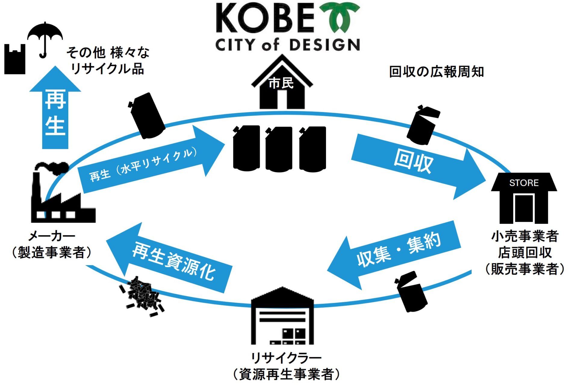 ①小売4社の神戸市内の店舗と資源回収ステーション施設で回収。(全国最大規模)