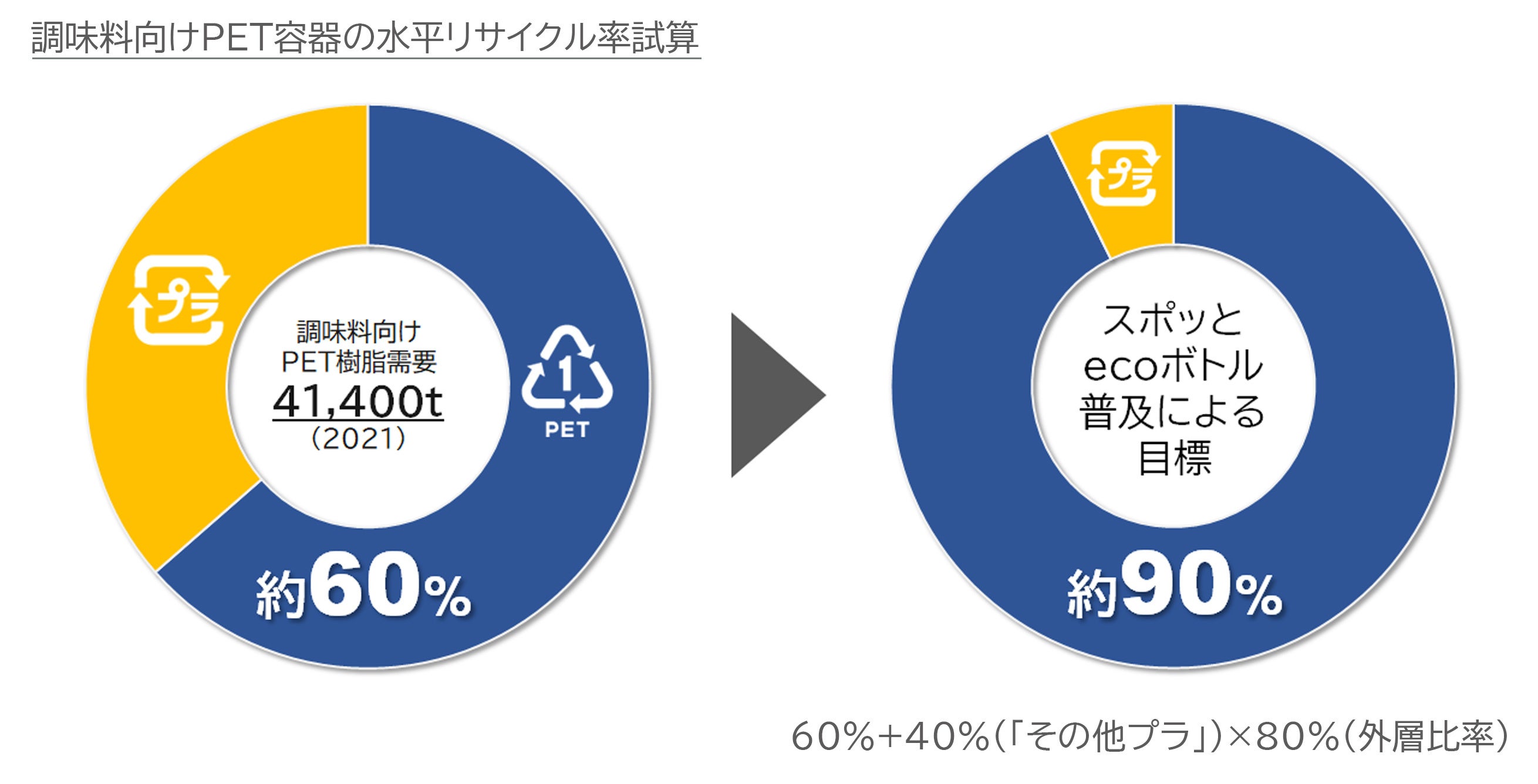 容器の80%を占めるPET外層は、内容物に触れることがありません。ゆえに水平リサイクルに組み込むことも可能な資源となります。これをもとに、前述の40%に上るPET製「その他プラスチック包装」を「スポッとecoボトル」に置き換えられたと仮定すると、調味料用PET容器の90%がリサイクル可能になります。