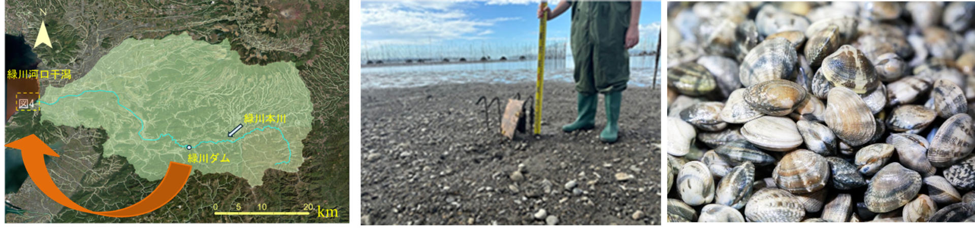 研究では緑川ダムの堆砂土を昨年(2024年)3月に緑川河口の緑川干潟に運搬して、アサリの生息砂床として干潟に散布しました。