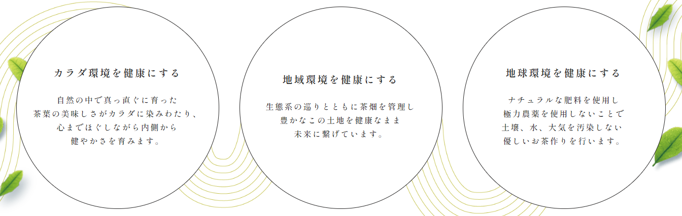 『すべての環境を、健康に。』という理念は、環境・地域・未来を守る大塚園のお茶づくりの指針となっています。