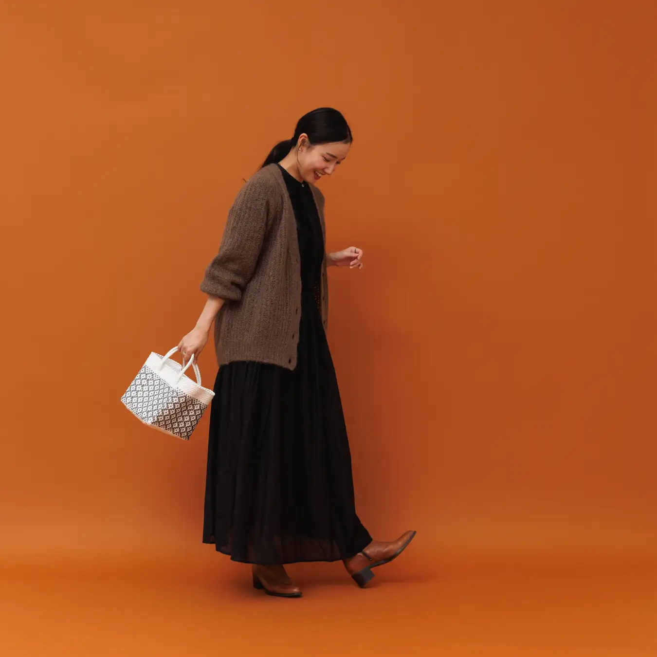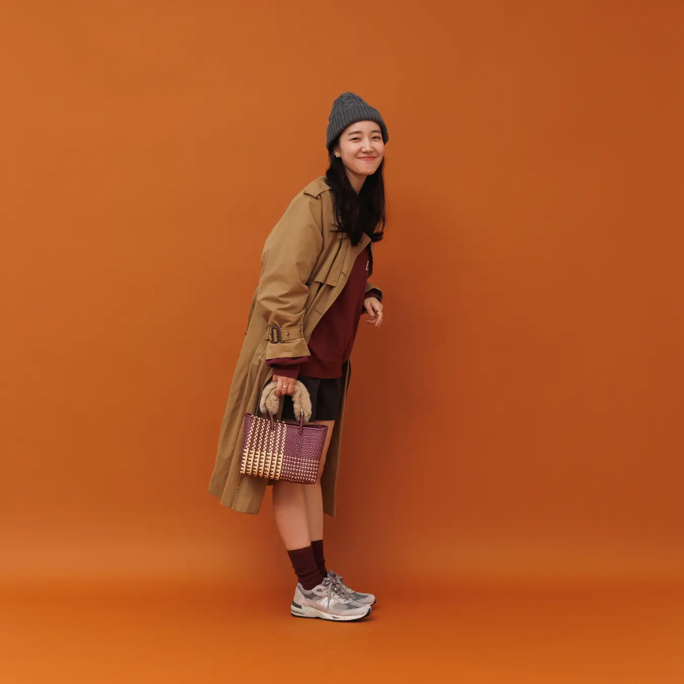 メルカドバッグの差し色効果や、あえて洋服は軽くバッグで重みを出すスタイリングで、重くなりがちな秋冬のコーディネートに抜け感をプラスしたそうです。