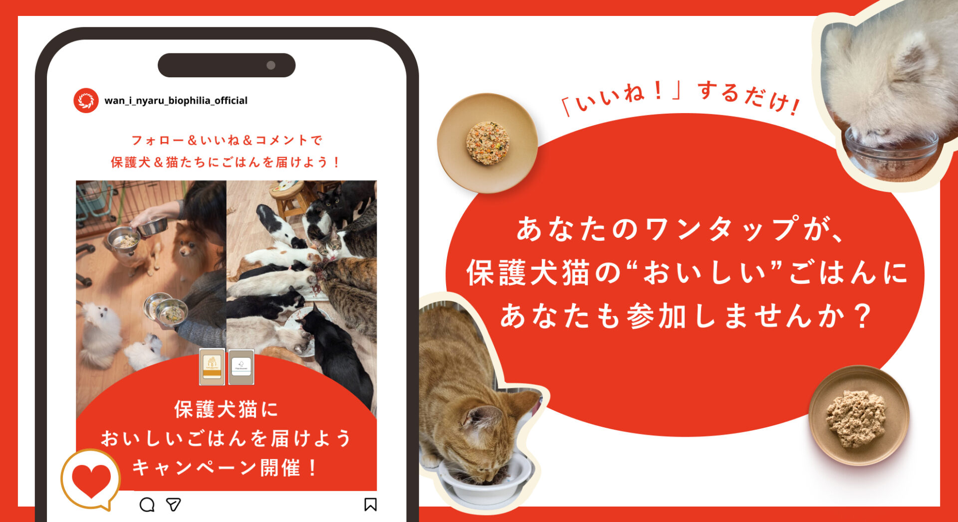 Instagram投稿への「いいね!」や、関連アカウントの「フォロー」など、誰でも簡単にできるSNS上のアクションを通じて、その数に応じた「ココグルメ」または「ミャオグルメ」が、保護団体を通じておいしいごはんを待つワンちゃん・ネコちゃんに届けられます。詳しくは下の参加方法をご覧ください。