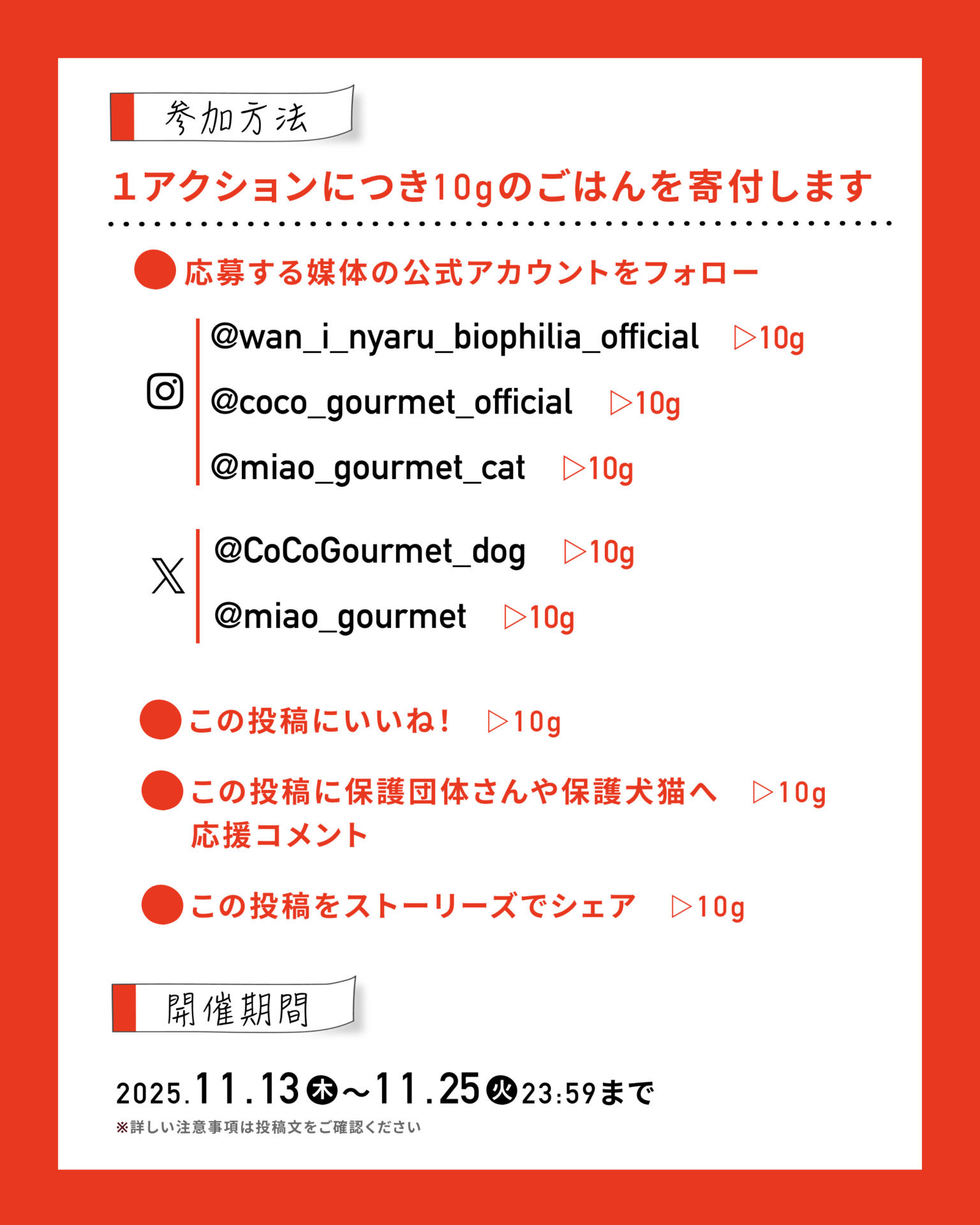 これを記念し、2025年11月13日(木)~11月25日(火)までの期間、「ココグルメ」「ミャオグルメ」のSNSアカウントと連動した「保護犬猫においしいごはんを届ける」SNS寄付企画が実施されています。